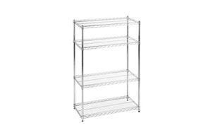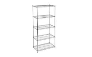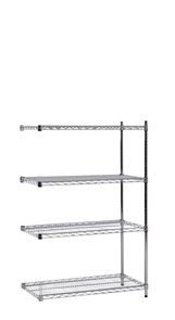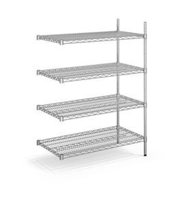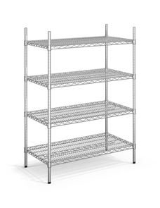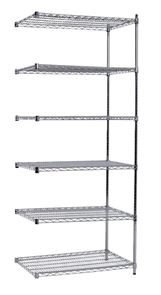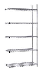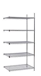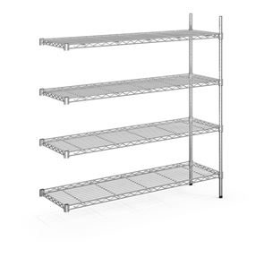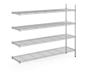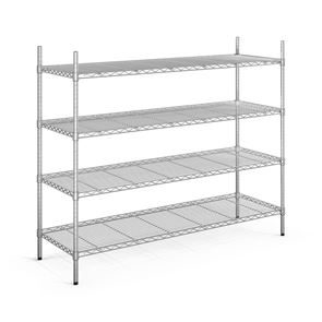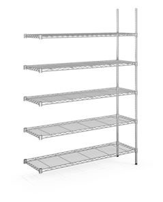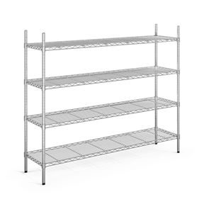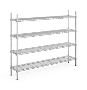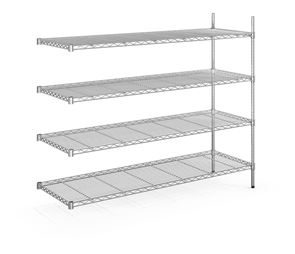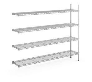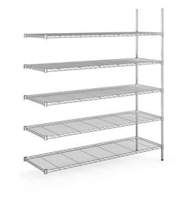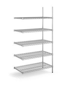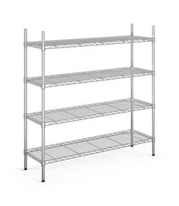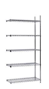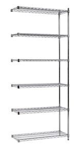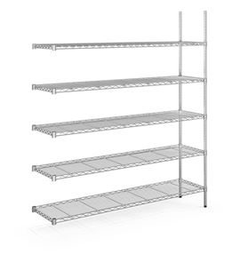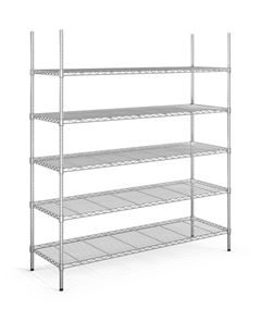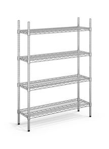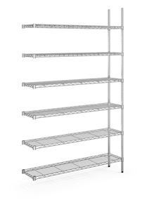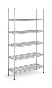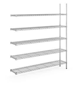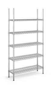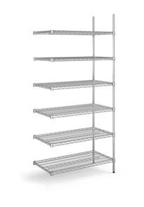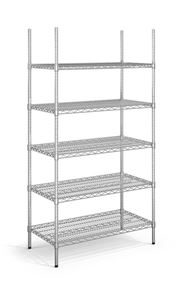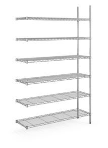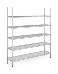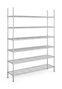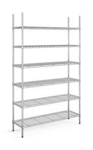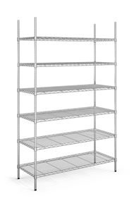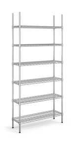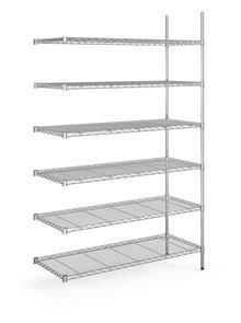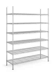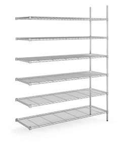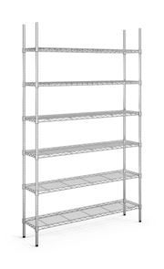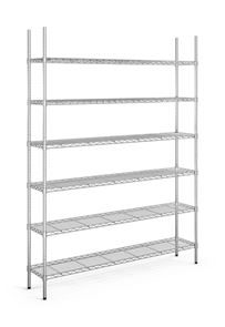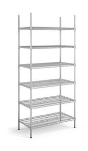 Trådhyller av forkrommet ståltråd Joel, belastning per hylleplate 250 kg, BxD 910 x 360 mm, utbyggingsseksjon, høyde 2180 mm, 6 hylleplater.