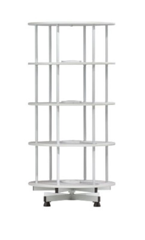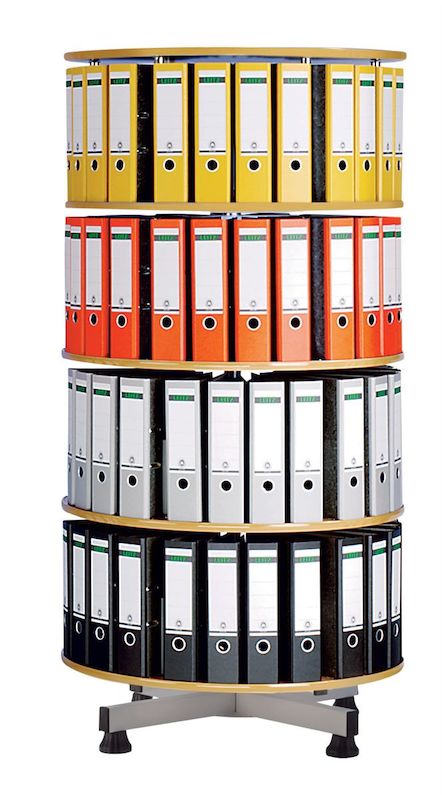 Permkarusell, Ø 1000 mm, H 1670, 4 hyller, grå. Hyller er helt vridbare. Har plass til ca. 80% flere permer sammenlignet med sammenlignbare hyller. Lett, lydløst løp. Enkel dreiing uten kulelager. Stabil stålkonstruksjon, lyesgrå (RAL 7035) lakkert. Hylleplater av lakkerte sponplater. En kant forhindrer at permene sklir ut. En dekkplate beskytter permene mot støv. Lastekapasitet per hylle 70 kg. Totalbelastningen er på 300 kg. Bestykning med hjul er bare tillatt for snurrer med maks. 4 hyller.