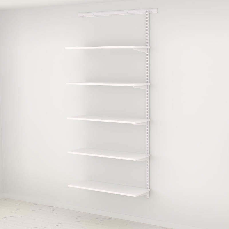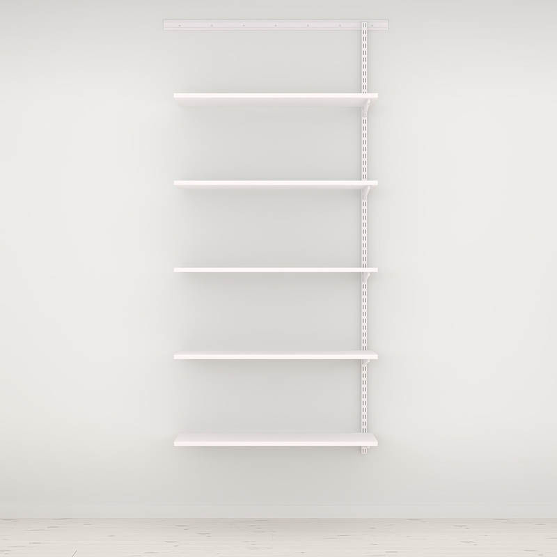 Hyllesystem ELFA vegghylle høy, påbyggingsseksjon, hvit laminat, B940xH2140xD325 mm. Komplett pakke med 5 stk hylleplater i laminat Inkl. 1 stk bærelist, 1 stk hengeskinne, 5 stk hylleknekter.