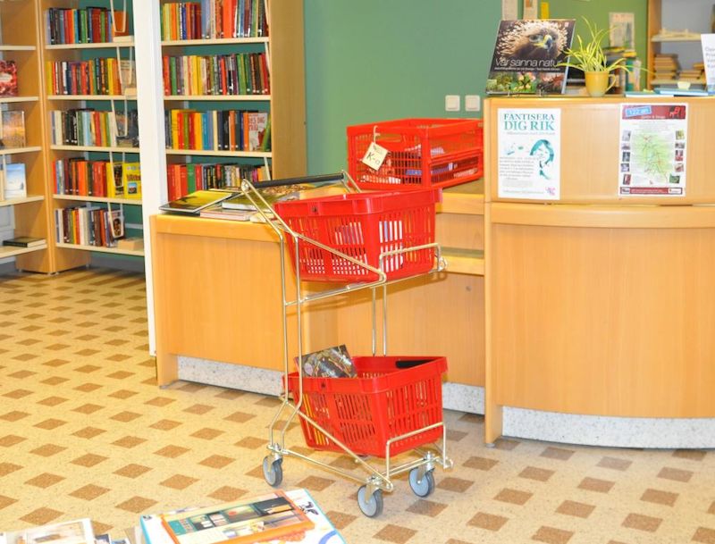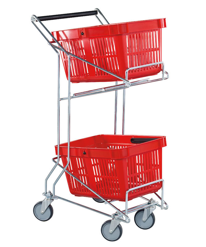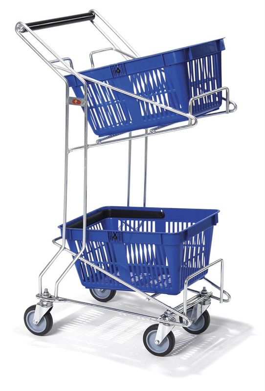 Handlekurvvogn til handlekurv Bolmen, for 2 kurver, elforsinket. Letthåndterlig vogn for 2 kundekurver. Elforsinket stativ. Høyde 960, bredde 260/415, dybde 560 mm.