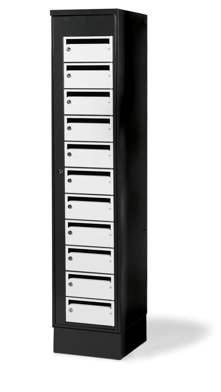 Post- og oppbevaringsskap bredde 800 mm, 22 låsbare rom. Rom av kraftig konstruksjon med sylinderlås. Skaphøyde inklusiv sokkel 1900 mm, dybde 400 mm. Stamme svart RAL 9005, rom hvit RAL 9003. Rom med brevåpning.