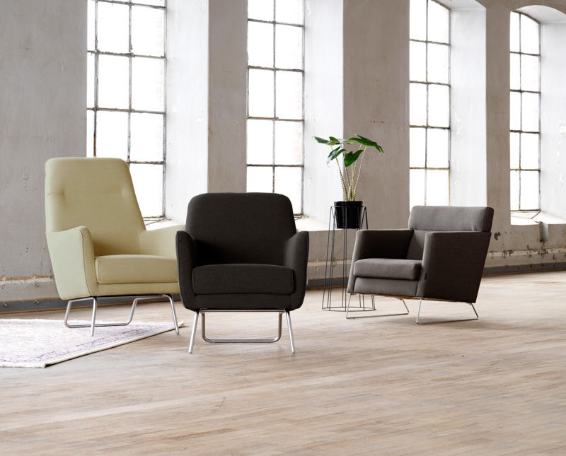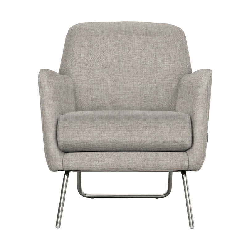 Lenestol Moss, lav rygg, beige stoff. Stilren og god lenestol i høy kvalitet med slitesterkt materiale og ben i børstet krom. Rammen er bygget av massivt tre i alle bærende deler. Putenes kjerne består av et høyelastiskt tilskåret kaldskum, trukket med fibervatt. Lenestolen kan fås i flere farger av stoff eller skinn samt med lav eller høy rygg for ekstra komfort.
