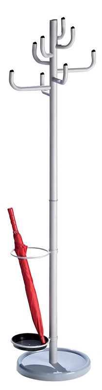 Stumtjener, 8 stålkroker, aluminium/sølv. Standrør av stål, pulverlakkert. Med paraplyholder og tung betongfylt fot.