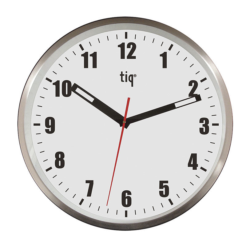 Stor veggklokke, Ø 475 mm. Ramme i aluminium, hvit urskive, flytende visere. Batterier følger ikke med.