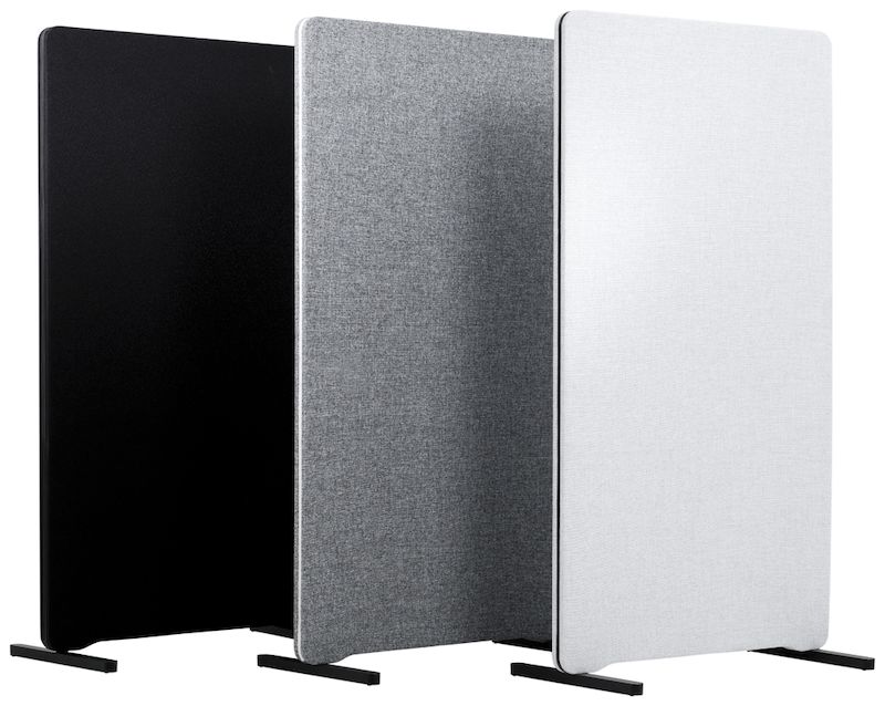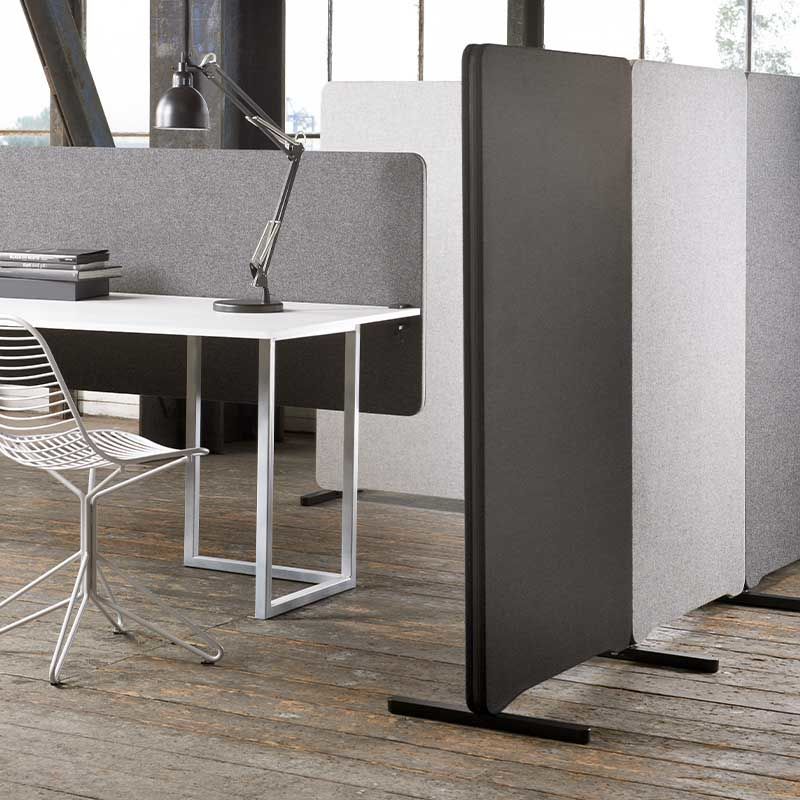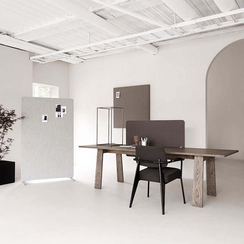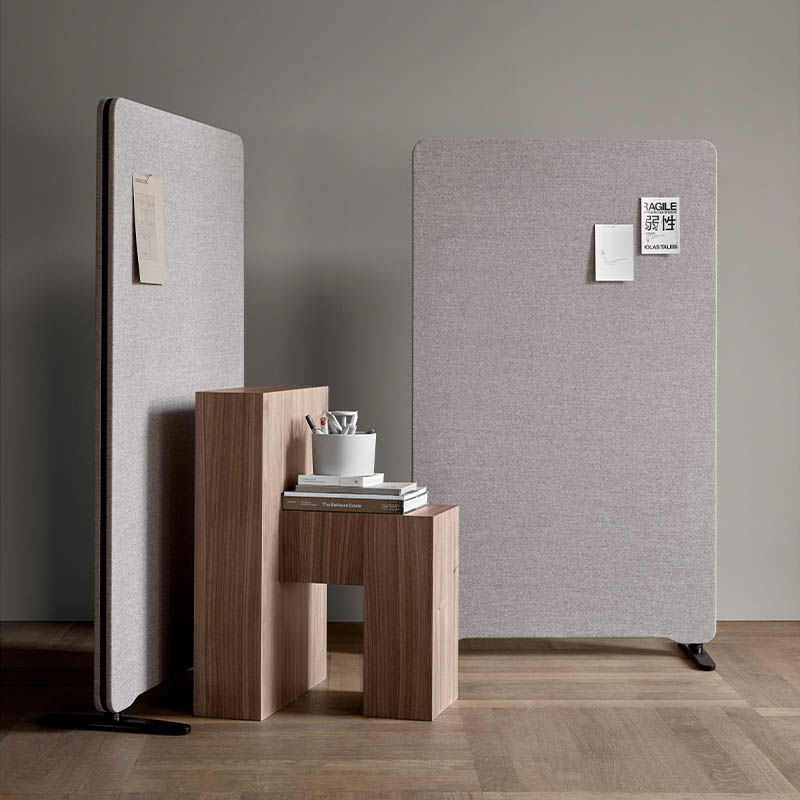 Moderne skjerm med enkel og ren design som samtidig appellerer til det fleksible kontoret. Skjermene demper effektivt forstyrrende støy som oppstår i åpne kontorlandskap. Gulvskjermen er bygget på en stamme i heltre med lydabsorberende fylling.