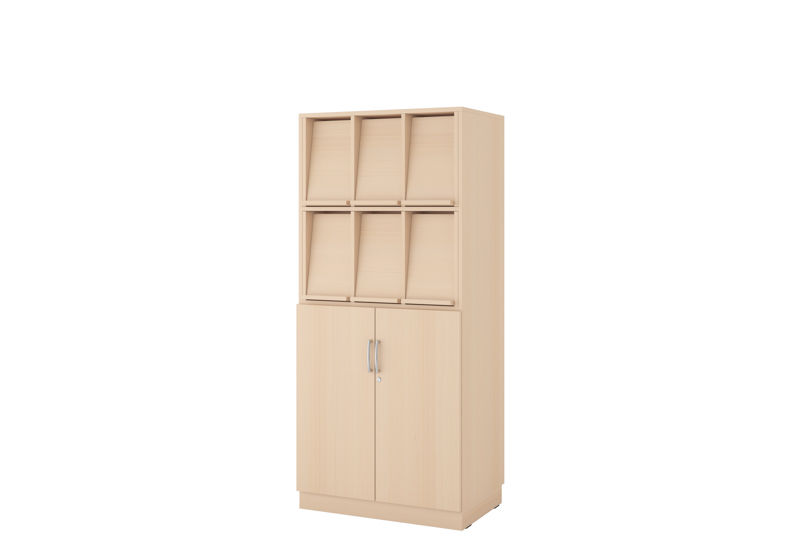 Brosjyrehylle Benna, BxDxH 810x400x1749, bjørk, med sokkel og dører. Med tidsskrift- og brosjyrehylle Benna kan du både stille ut og oppbevare alle dine publikasjoner. En perfekt måte å få orden på tidsskrifter og brosjyrer. Hver tidsskriftholder fungerer også som en dør, og bak døren finnes det et stort oppbevaringsrom hvor du kan oppbevare publikasjonene du ikke lenger vil ha fremme. Slik har du alltid kontroll på hvor tidsskriftene og brosjyrene befinner seg når du behøver dem. Du trenger altså ikke et ekstra møbel for oppbevaring av tidsskrifter og brosjyrer, ganske enkelt genialt! Det stilfulle skandinaviske designet gjør at hyllen passer inn i det fleste kontormiljøer. Finnes i forskjellige modeller: høy, lav, med eller uten dører samt med ben eller sokkel. Tidsskrift- og brosjyrehyllen er laget av holdbare materialer og er kledd med laminat som er lett å rengjøre. Velg mellom fargene bøk, bjørk, eik eller hvit.