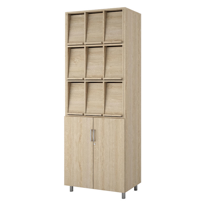 Brosjyrehylle Benna, BxDxH 810x400x2160, eik, med ben og dører. Med tidsskrift- og brosjyrehylle Benna kan du både stille ut og oppbevare alle dine publikasjoner. En perfekt måte å få orden på tidsskrifter og brosjyrer. Hver tidsskriftholder fungerer også som en dør, og bak døren finnes det et stort oppbevaringsrom hvor du kan oppbevare publikasjonene du ikke lenger vil ha fremme. Slik har du alltid kontroll på hvor tidsskriftene og brosjyrene befinner seg når du behøver dem. Du trenger altså ikke et ekstra møbel for oppbevaring av tidsskrifter og brosjyrer, ganske enkelt genialt! Det stilfulle skandinaviske designet gjør at hyllen passer inn i det fleste kontormiljøer. Finnes i forskjellige modeller: høy, lav, med eller uten dører samt med ben eller sokkel. Tidsskrift- og brosjyrehyllen er laget av holdbare materialer og er kledd med laminat som er lett å rengjøre. Velg mellom fargene bøk, bjørk, eik eller hvit.