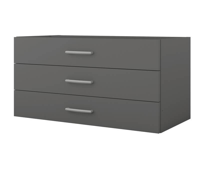 Innsats til hylle Benna, BxDxH 772x384x392, mørkegrå, 3 skuffer. Sett sammen akkurat den oppbevaring du ønsker, med ulike innsatser i flere farger. Fra åpne hyller for lett tilgjengelig permoppbevaring eller låsbare sjalusier for mer personlig oppbevaring, små skuffer for småsaker og større skuffer for mer plass. Alle innsatser kommer ferdigmonterte og er bare å sette på plass i valgt hylle og forankres med medfølgende skruer.
