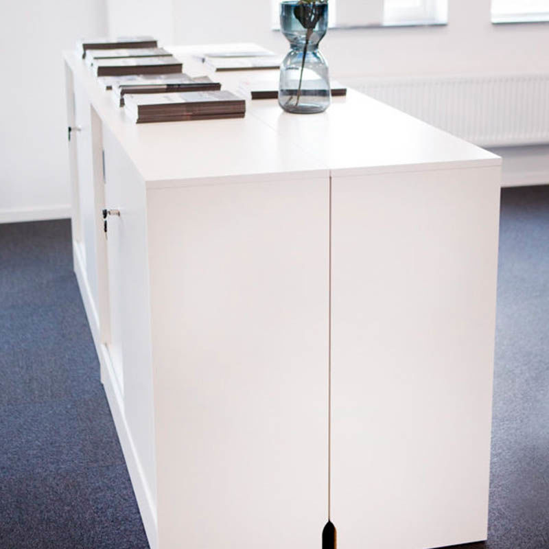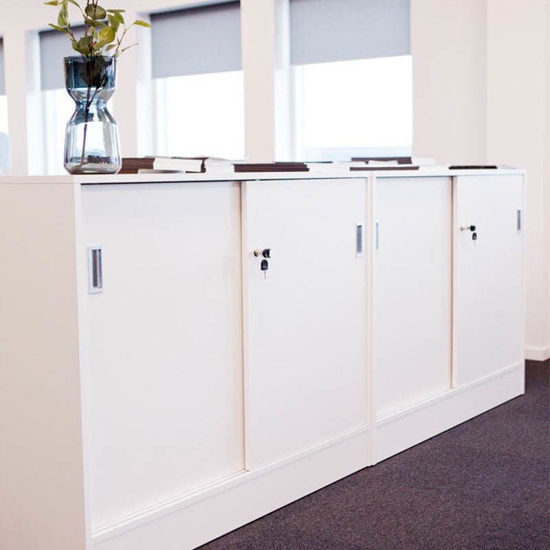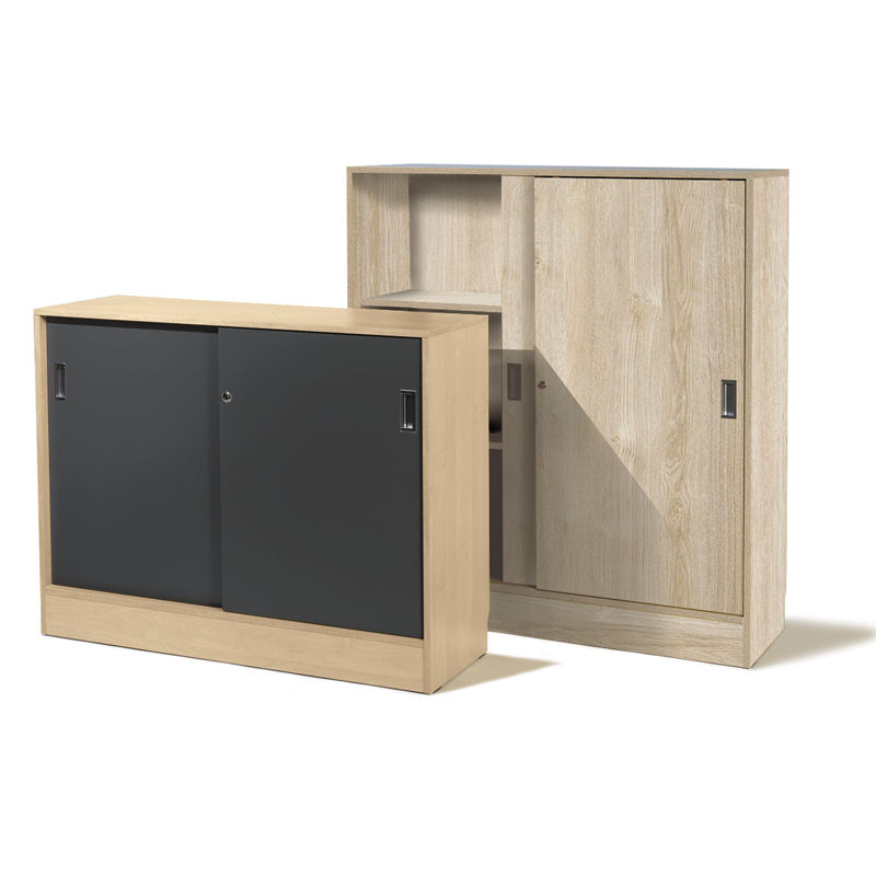Kontorskap Chicago med låsbare skyvedører. Oppbevaring med låsbare skyvedører i to høyder. Stammen er produsert i bjørke-, eikelaminat eller hvit laminat. Dører i bjørke-, eikelaminat, hvit eller grå laminat. Leveres montert. Laminat: Plate belagt med bøke-, eike-, grå- eller hvitfarget dekor med kantlist av ABS-plast. Bordplaten er hard og svært ripe- og slagbestandig. Fargen er konstant, dvs. den endrer seg ikke utseendemessig når den eldes.