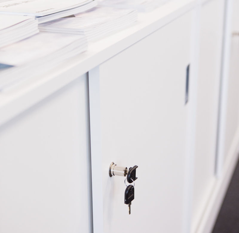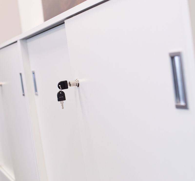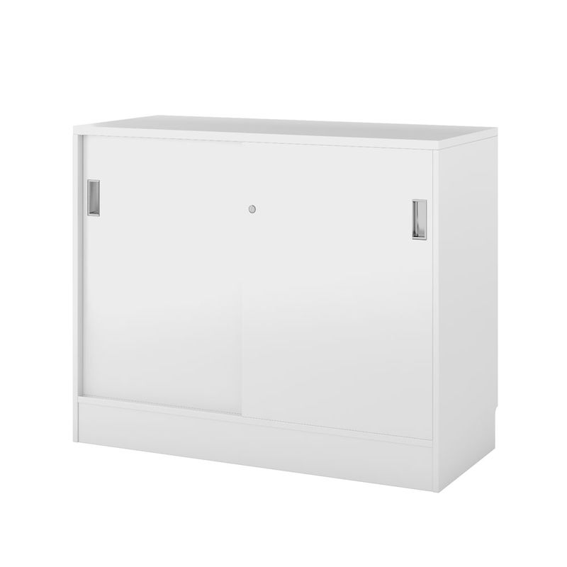 Kontorskap Chicago, BxDxH 1215x400x948 mm, hvit/hvit. Oppbevaring med låsbare skyvedører i to høyder. Stammen er produsert i bjørke-, eikelaminat eller hvit laminat. Dører i bjørke-, eikelaminat, hvit eller grå laminat. Leveres montert. Laminat: Plate belagt med bøke-, eike-, grå- eller hvitfarget dekor med kantlist av ABS-plast. Bordplaten er hard og svært ripe- og slagbestandig. Fargen er konstant, dvs. den endrer seg ikke utseendemessig når den eldes.