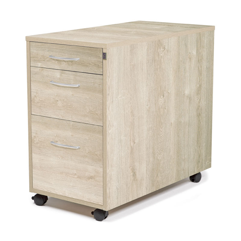 Skuffeseksjon Miami med hengemappeholder, laminat, D 800 mm, eik . Praktisk skuffeseksjon på hjul, ekstra høy. Med sentrallås, 2 låsbare hjul og pennerom. Laminat: plate belagt med bøke-, bjørke-, eike- eller hvitfarget dekor med kantlist av ABS-plast. Bordplaten er hard og svært ripe- og slagbestandig. Fargen er konstant, dvs. den endrer seg ikke utseendemessig når den eldes.