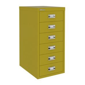 Skuffeskap BISLEY Classic 29 med 6 skuffer A4, gul. Skuffehøyde 87 mm. Bisley skuffeskap gir en ryddig og praktisk oppbevaring på kontoret. Produsert i lakkert stål. Kan plasseres direkte på gulvet eller kombineres med sokkel eller hjul. Finnes i to grunnstørrelser, basert på de klassiske dokumentstørrelsene A4 og A3. Finnes i 3 ulike høyder avhengig av størrelsen. Etikettholder på hver skuff. Skuffeinnsatser kan kjøpes som tilbehør så du kan holde orden på dine småting.