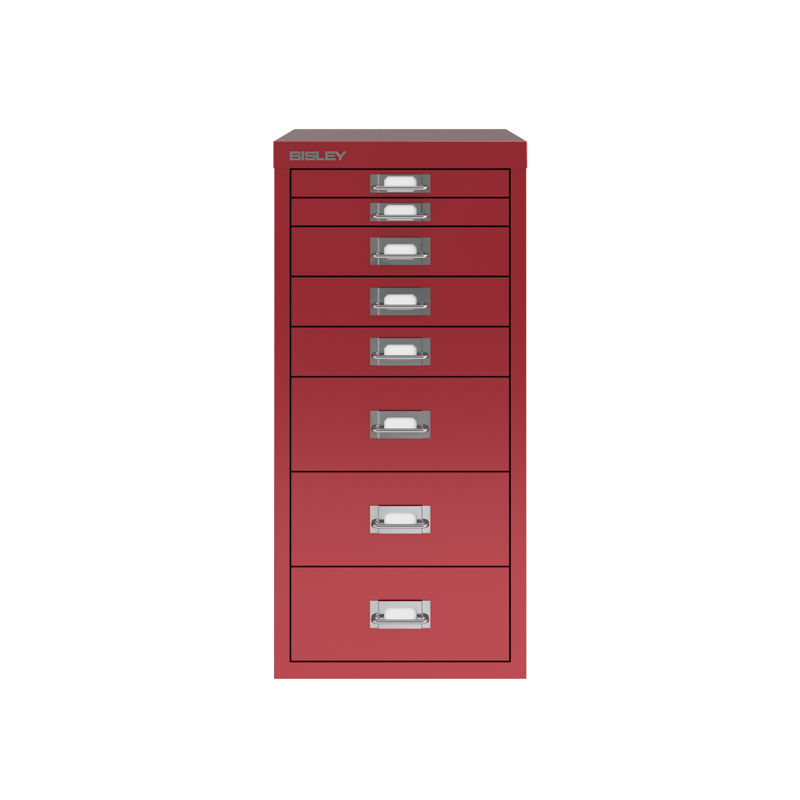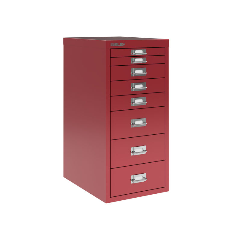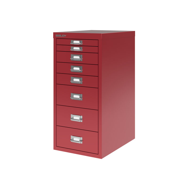Skuffeskap BISLEY Classic 29 med 8 skuffer A4, rød. 3 ulike skuffehøyder. Bisley skuffeskap gir en ryddig og praktisk oppbevaring på kontoret. Produsert i lakkert stål. Kan plasseres direkte på gulvet eller kombineres med sokkel eller hjul. Finnes i to grunnstørrelser, basert på de klassiske dokumentstørrelsene A4 og A3. Finnes i 3 ulike høyder avhengig av størrelsen. Etikettholder på hver skuff. Skuffeinnsatser kan kjøpes som tilbehør så du kan holde orden på dine småting.