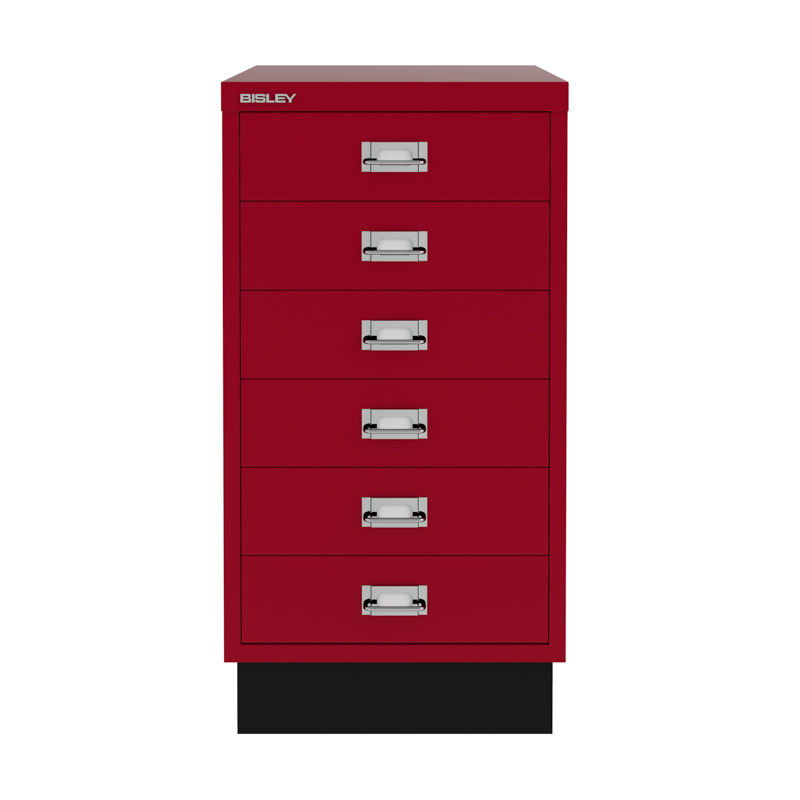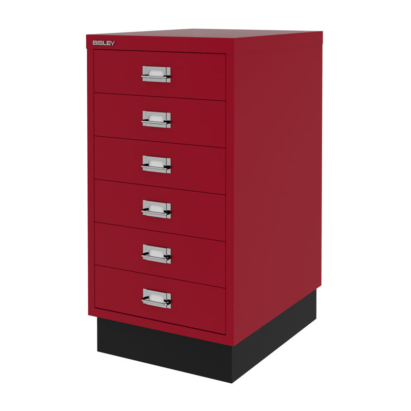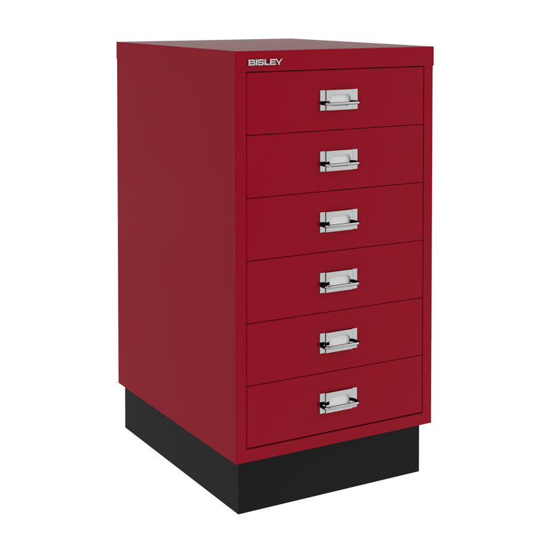 Skuffeskap BISLEY Classic A3, med sokkel, 6 skuffer, rød. Skuffehøyde 87 mm. Bisley skuffeskap gir en ryddig og praktisk oppbevaring på kontoret. Produsert i lakkert stål. Sokkel kan kombineres eller erstattes med hjulunderstell. Finnes i to grunnstørrelser, basert på de klassiske dokumentstørrelsene A4 og A3. Finnes i 2 ulike høyder avhengig av størrelsen. Etikettholder på hver skuff. Skuffeinnsatser kan kjøpes som tilbehør så du kan holde orden på dine småting.
