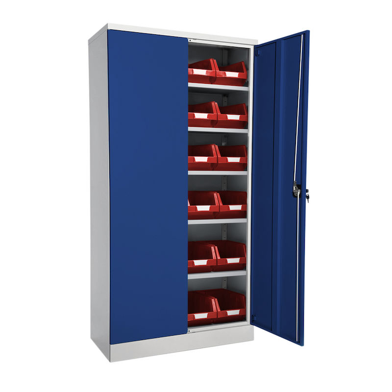 Oppbevaringsskap med lagerbokser Nilas, HxBxD 1830 x 915 x 421 mm, stamme lysegrå / dør blå / bokser røde. Oppbevaringsskap Nilas med 24 lagerbokser. Dette oppbevaringsskapet er enkelt å montere og egner seg godt til lager, verksted eller produksjon. Skapet leveres flatpakket men er takket være sitt intelligente design raskt og enkelt å sette sammen.
