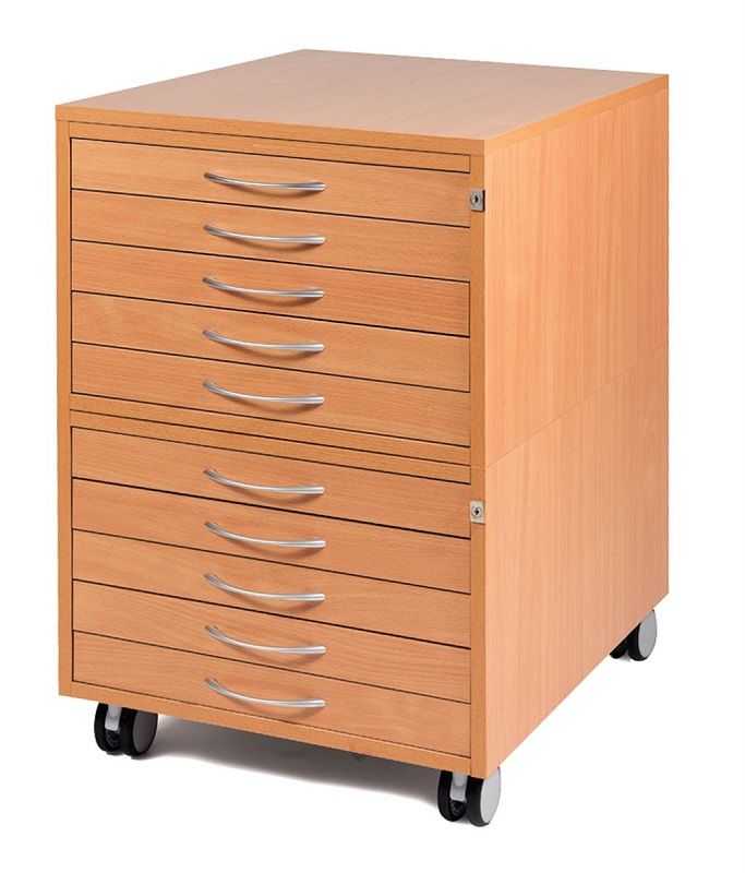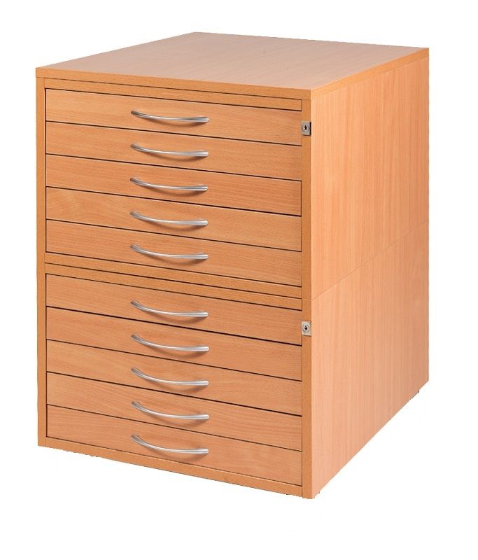 Tegningsskap Kolima, A2, påbyggingsbart, 5 skuffer, bøk laminat. Sett sammen ditt eget tegningsskap helt etter egne behov og ønsker. Velg så mange skuffeseksjoner du vil ha. Seksjonene festes til hverandre eller fjernes hvis behovet for oppbevaringsplass endres. Avslutt med en topplate og kombiner med en baseseksjon med sokkel, benstativ eller hjulsett. De fem skuffene har forsinkede hjørner.