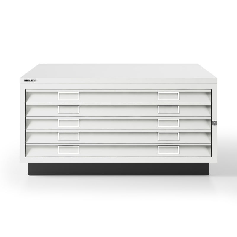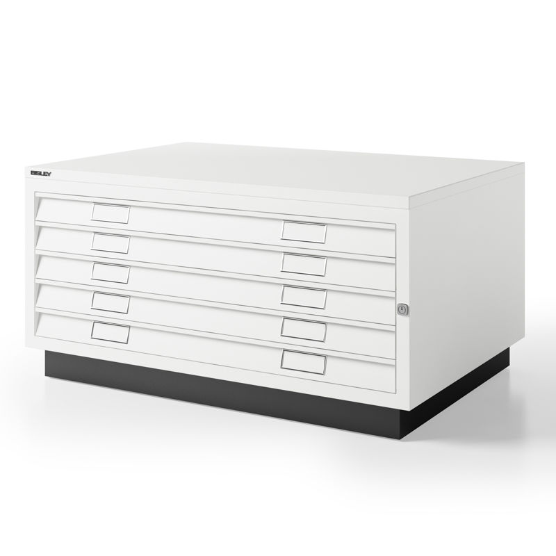 Tegningsskap BISLEY, A1, 5 skuffer, hvit. Et stabilt og kraftig skap i lakkert helsveiset massivt stål med et moderne og klassisk utseende. Kan også brukes som romavdeler da baksiden er lakkert som skapet. Sentrallås som låser alle skuffer i skapet. Finnes i to størrelser, og med 5 alt. 10 skuffer. Leveres med sokkel.