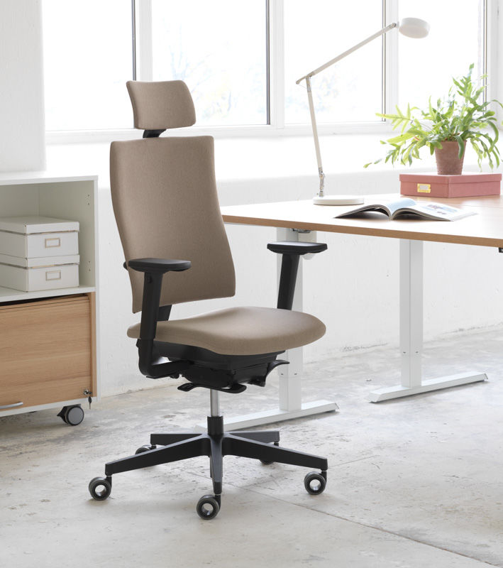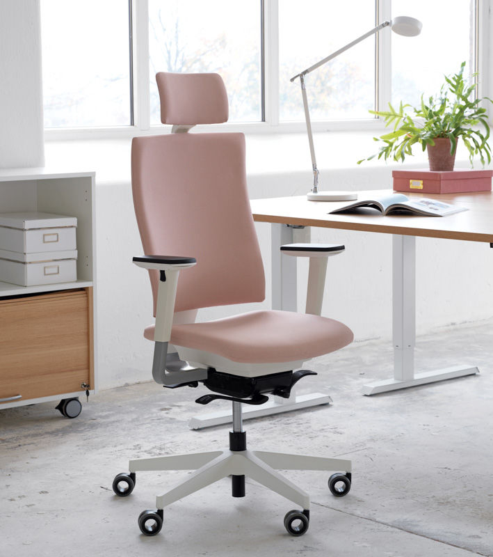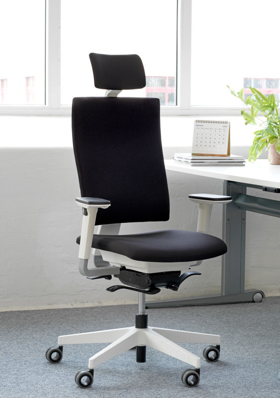 Kontorstol Bianca, flere farger, med eller uten nakkestøtte. Bianca er en kontorstol i moderne design med hvitt eller sort fotkryss, stamme og armlener. Armlener innstillbare i dybde, høyde og bredde. Stolen leveres med hjul for harde gulv.