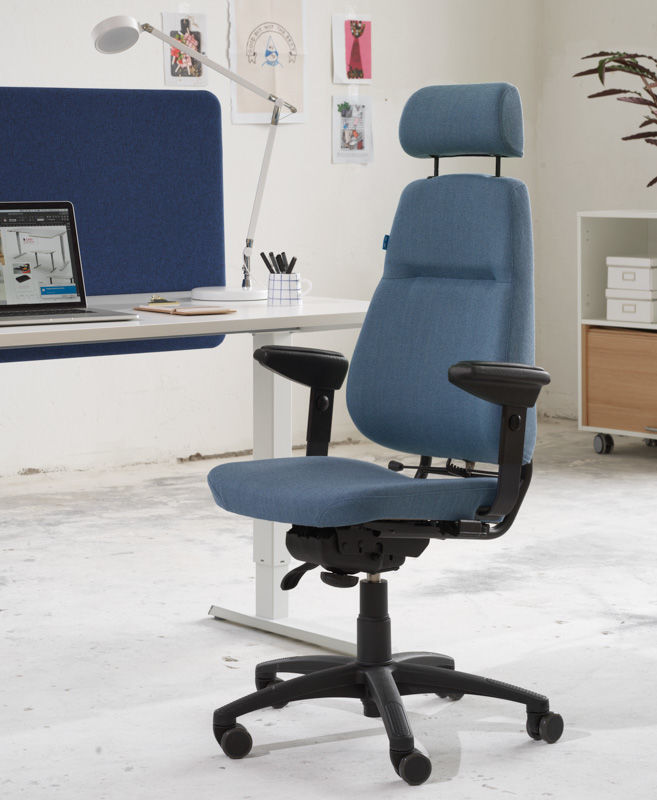 Kontorstol Sverigestolen 814 XL inkl. armlener og nakkestøtte. Kontorstol for deg som er lang eller storvokst. Ligner på Klassikern, men med høyere ryggpute og større sete. Sitteputen kan skyves 50 mm frem- eller bakover.