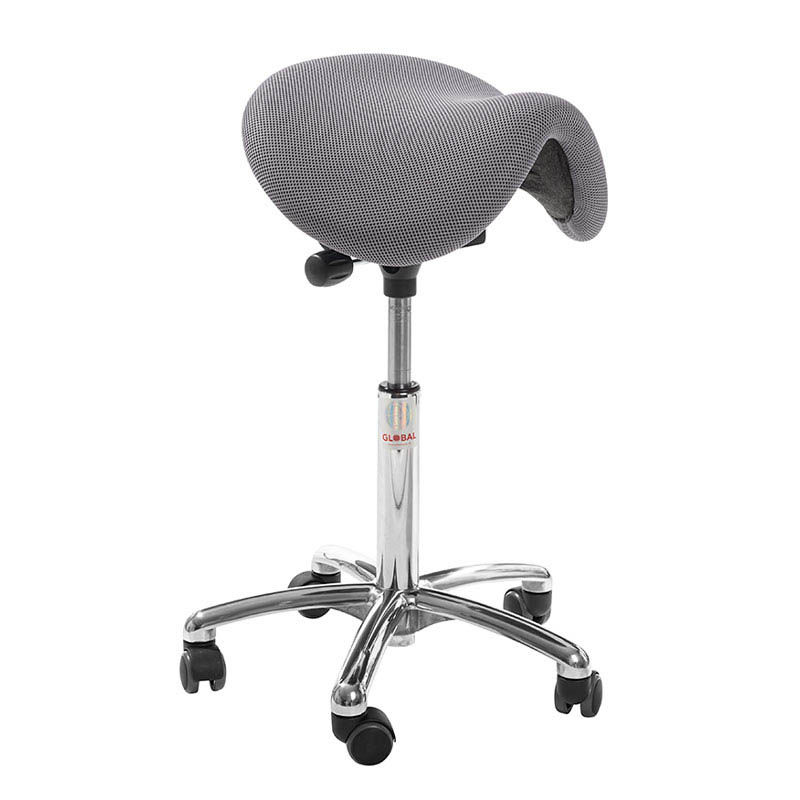 Sadelstol Dalton, grått stoff, uten ryggstøtte. Sadelstolen er formet som en "klassisk" cowboy sadel, vattert med skum og kledd i kunstlær alternativt i stoff. Den gir god komfort og ergonomisk arbeidsstilling. Dalton finnes med fire ulike setemekanismer som på ulike måter gir optimal ergonomisk sittestilling som innebærer at du kan sitte lenge uten å kjenne trøtthet i kroppen. Setestørrelse: BxDxH 415x345x285 mm. Aluminium stativ ø 500 mm, med 5 lettrullende hjul. Freefloat sete: trinnløs justering av sete 12° forover og 6° bakover.