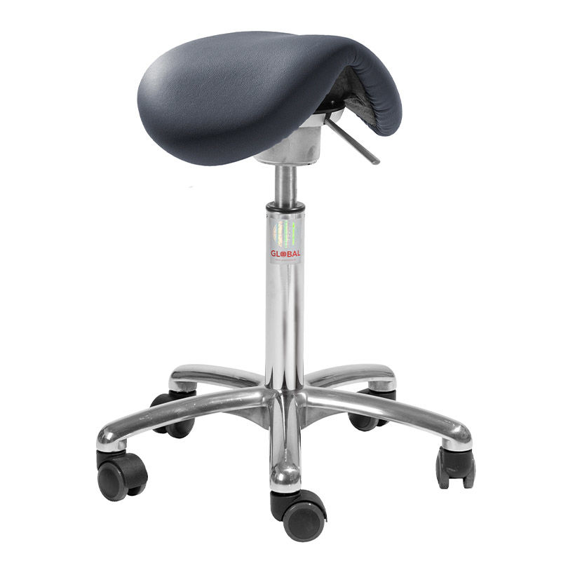 Sadelstol Dalton, blått kunstlær, fleksmekanisme, uten ryggstøtte. Sadelstolen er formet som en "klassisk" cowboy sadel, vattert med skum og kledd i kunstlær alternativt i stoff. Den gir god komfort og ergonomisk arbeidsstilling. Dalton finnes med fire ulike setemekanismer som på ulike måter gir optimal ergonomisk sittestilling som innebærer at du kan sitte lenge uten å kjenne trøtthet i kroppen. Setestørrelse: BxDxH 415x345x285 mm. Aluminium stativ ø 500 mm, med 5 lettrullende hjul. Fleksmekanisme: trinnløs justering av setevinkelen alle veier, justerer etter tyngdpunktet som gir en optimal ergonomisk sittestilling.