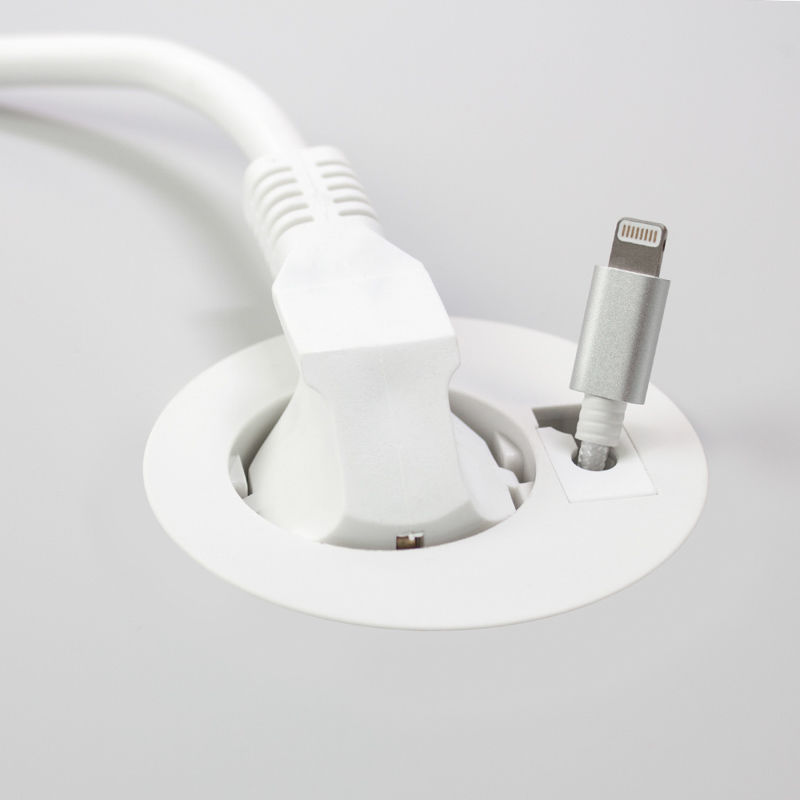 Stikkontakt nedfellbar Powerdot Midi 60, hvit, strøm og gjennomføringshull. Powerdot er en serie med lade- og media/datauttak i forskjellige utførelser for både skrive- og konferansebord. Med sitt estetiske utseende og detaljer får du strøm, data og media når du trenger det. Leveres med 1,5 m tilkoblingskabel Schuko alt. USB-230V nettadapter.