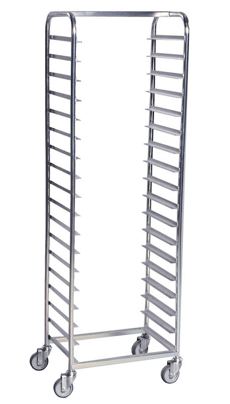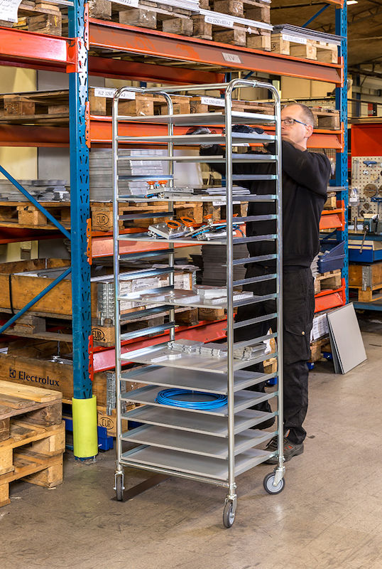 Med 25 mm tykke stålrør tåler vognen en maksimal belastning på 150 kg. Brettstativet har en avstand på 90 mm mellom sporene og kan også enkelt brukes som bakerivogn. Utstyrt med 4 svingbare hjul.