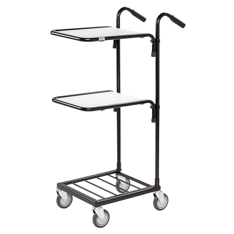 En liten og smart plukkvogn med 2 hyller til kontoret, skolen eller butikken. Høyden på hyllene / kurvene kan justeres trinnløst. Plukkvognen har en svartlakkert stålramme med fire svingbare hjul. Velg mellom tre modeller; en med to kurver, en med to hyller eller en modell med en hylle og en kurv. Mål vogn: L 660, B 385, H 1090 mm. Mål hyller: 410 x 355 mm. Mål kurv: 415 x 355 x 220 mm. Maks. belastning: 35 kg. Hjul Ø 100 mm.
