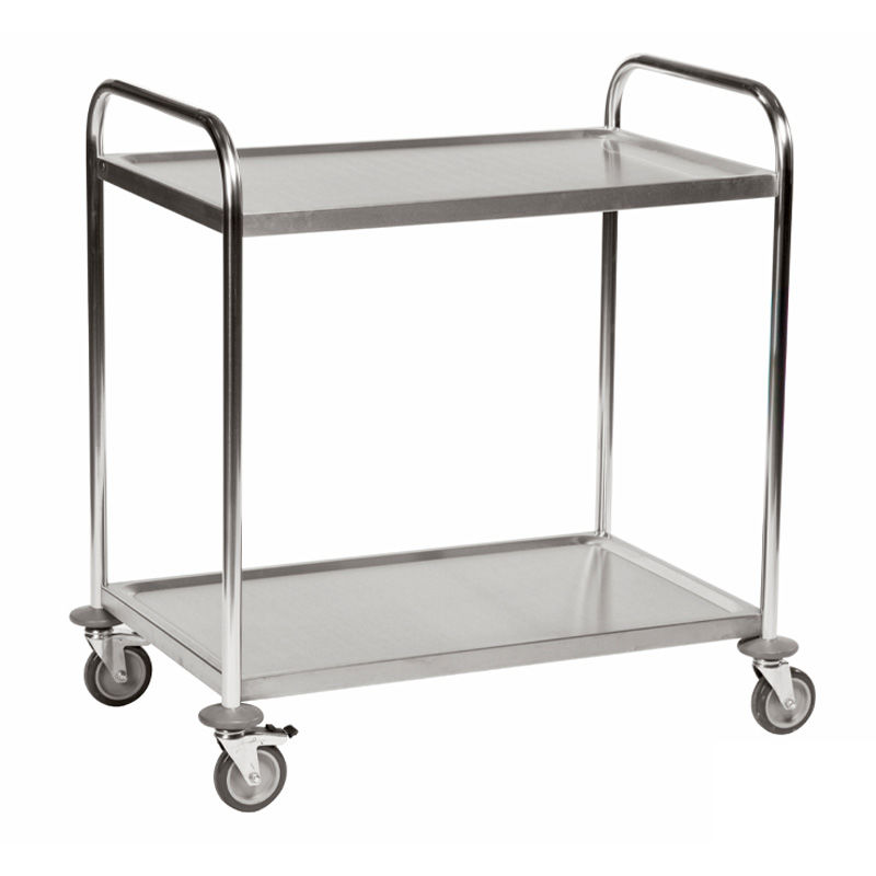 Serveringsvogn, rustfritt stål, 2-4 hyller. En serveringsvogn med understell og hyller av rustfritt stål. De umonterte vognene har hyller med vulstkant. Må tørkes av etter bruk så ingen rester av væske blir liggende. 4 svingbare hjul Ø 100 mm, 2 med brems. Maks belastning 100-200 kg avhengig om det er en umontert eller helsveiset variant. Finnes også en variant med kant som beskytter ekstra under transport.