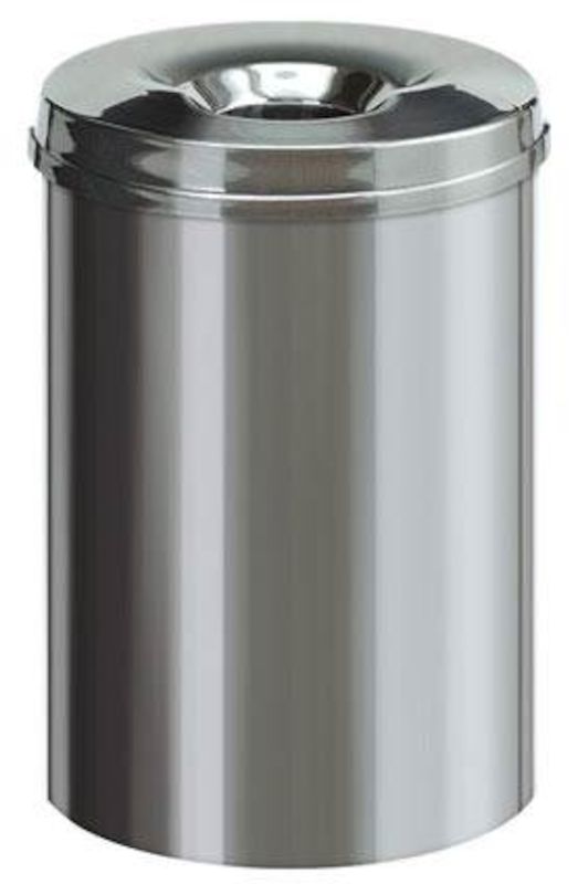 Papirkurv, brannsikker, rustfritt stål, 30 l, høyde 470 mm. Disse selvslukkende papirkurvene forhindrer at det oppstår branner. Stamme av stålplate, farget plastovertrukket. Slukketopp av stålplate og plastovertrukket.