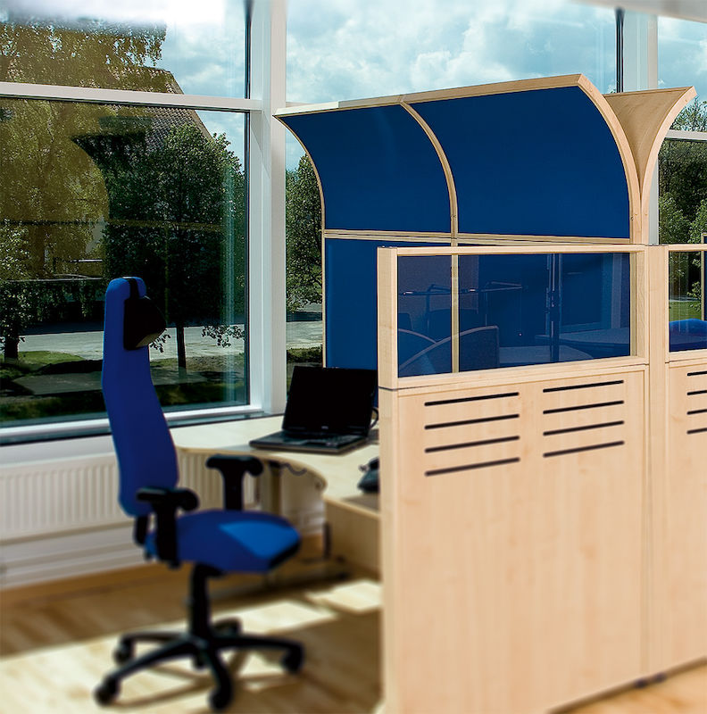 Stilren design av ekstremt lyddempende påbygging til Silence skjermvegger. Silence Sky påbygging er 560 mm høy og monteres på 1500 mm skjerm, men kan også monteres på 1900 mm høy skjerm (1500+400).