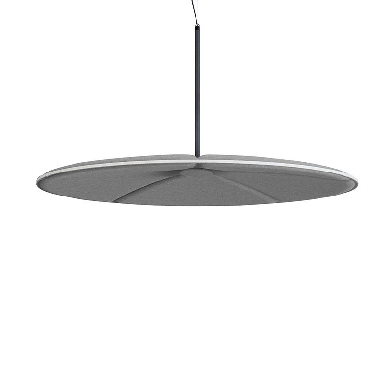 Lydabsorbent Lily, lampe, uten belysning, Ø 90, 900x61 mm, hvit kjerne, Blazer grå. Lampen har et helt nytt formspråk, der den lyddempende funksjonen er integrert uten å påvirke hverken objektets form eller opplevelsen av rommet. Lily er 90 eller 120 cm i diameter og er beregnet for å dempe lyden i store rom, for eksempel restauranter og åpne kontorlandskap - miljøer der både støy og visuelle inntrykk påvirker. Den lydabsorberende lampen består av en stoffkledd kjerne av hvit polyester, finnes i 6 forskjellige farger i stoff Blazer. Takfeste og vaier følger med. Vaierens lengde er 3 m.