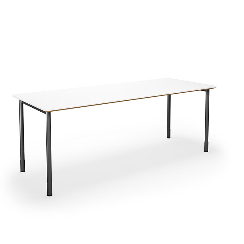 Bord i moderne design med en 25 mm tykk bordplate. Platen har fasede kanter, noe som gir et stilrent inntrykk av et tynt og moderne bord. De fasede kantene er laget for å passe inn i et moderne miljø med frittstående plassering av bordet. Rett plate med en slitesterk flate. Runde pulverlakkerte stativ i stål gjør at bordene er stabile.