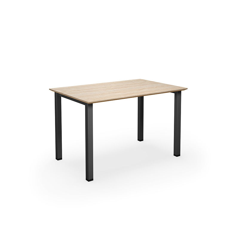 Bord i moderne design med en 25 mm tykk bordplate. Platen har fasede kanter, noe som gir et stilrent inntrykk av et tynt og moderne bord. De fasede kantene er laget for å passe inn i et moderne miljø med frittstående plassering av bordet. Rett plate med en slitesterk flate. Firkantede pulverlakkerte ben i stål gjør bordene stabile.
