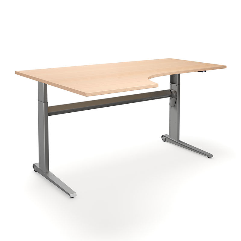 Hev og senk hjørneskrivebord Dallas, venstre, LxB 1800x1200 mm, bjørk/sølv. Et lett og enkelt bord. Justerbar høyde 685 – 1250 mm inkl. plate. Hastighet 25 mm/s. Maks. belastning 80 kg spredt last. Stativ sølvlakkert RAL 9006. Stativet har 2 hjul som gjør det enkelt å flytte bordet. Plate av bøk-, bjørk-, eik-, hvit- eller grå laminat, tykkelse 25 mm. Laminat: Plate belagt med bøk-, bjørk-, eik-, hvit- eller gråfarget dekor med kantlist av ABS-plast. Bordplaten er hard og svært ripe- og slagbestandig. Fargen er konstant, dvs. den endrer seg ikke utseendemessig når den eldes.