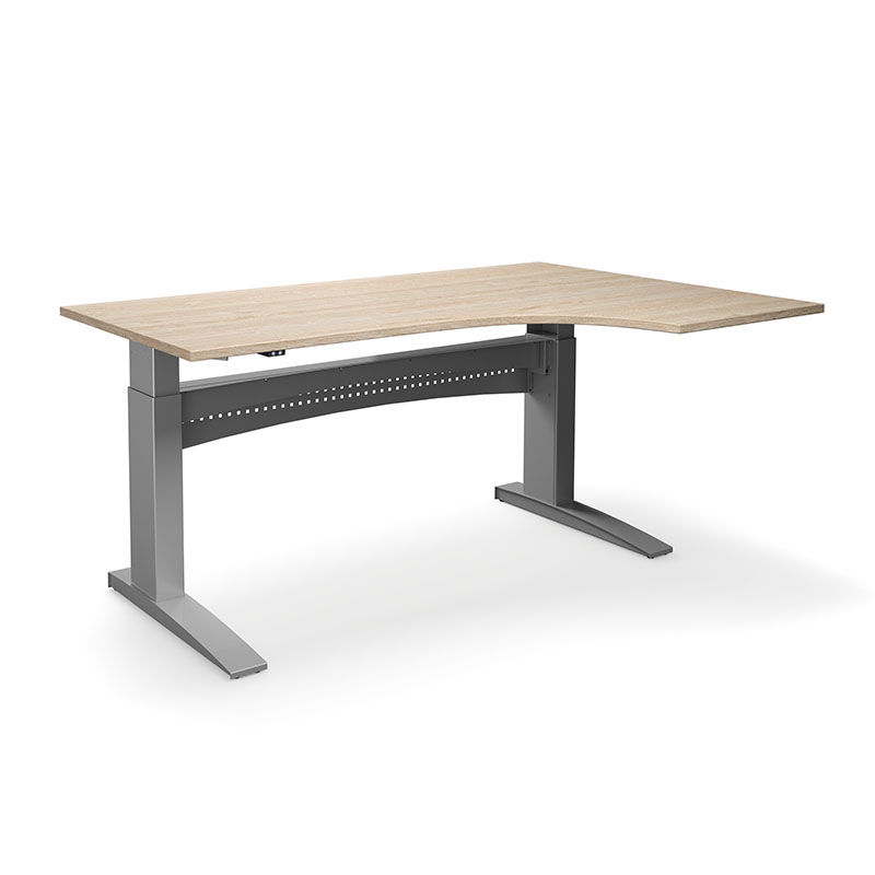 Hev og senk hjørneskrivebord Denver, maks. 150 kg. Høydejusterbart, H 630 - 1200 mm, hastighet 22 - 30 mm/s synkronlift. Maks. belastning 150 kg (spredt last). Stativ i svart strukturlakk RAL 9004 eller sølv RAL 9006. Bredde på stativet er 1560 mm. Platen finnes i både laminat og finer. Laminat: Plate belagt med bøke-, bjørke, eike- eller hvitfarget dekor med kantlist av ABS-plast. Bordplaten er hard og svært ripe- og slagbestandig. Fargen er konstant, dvs. den endrer seg ikke utseendemessig når den eldes. Finer: Plate belagt med et tynt sjikt av ekte tre i bøk eller bjørk med kantlist av massivtre. Overflaten har en naturlig trefølelse og er mykere enn laminat. Akkurat som i naturen eldes tre, og med tiden får det en vakker patina som bare et naturlig materiale kan få.