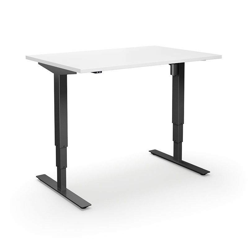 Hev og senk skrivebord Atlanta, rett plate, LxB 1200x800 mm, hvit/svart. Maksbelastning 150 kg utbredd last. Høydejusterbart H 630 - 1280 (høydeforskjell 650 mm), hastighet 25 mm/s, stativ lakkert i hvitt, sølv eller svart. Plate belagt med en bøk-, bjørk-, eik-, grå- eller hvitfarget dekor med kantlist av ABS-plast. Overflaten er hard og veldig ripe- og slagfast. Fargen er konstant, dvs den forandres ikke utseendemessig ved aldring.