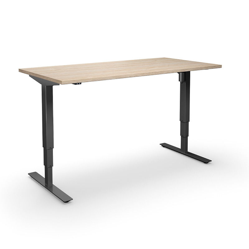 Hev og senk skrivebord Atlanta, rett plate, LxB 1600x800 mm, eik/svart. Maksbelastning 150 kg utbredd last. Høydejusterbart H 630-1280 (høydeforskjell 650 mm), hastighet 25 mm/s, stativ lakkert i hvitt, sølv eller svart. Plate belagt med en bøk-, bjørk-, eik-, grå- eller hvitfarget dekor med kantlist av ABS-plast. Overflaten er hard og veldig ripe- og slagfast. Fargen er konstant, dvs den forandres ikke utseendemessig ved aldring.