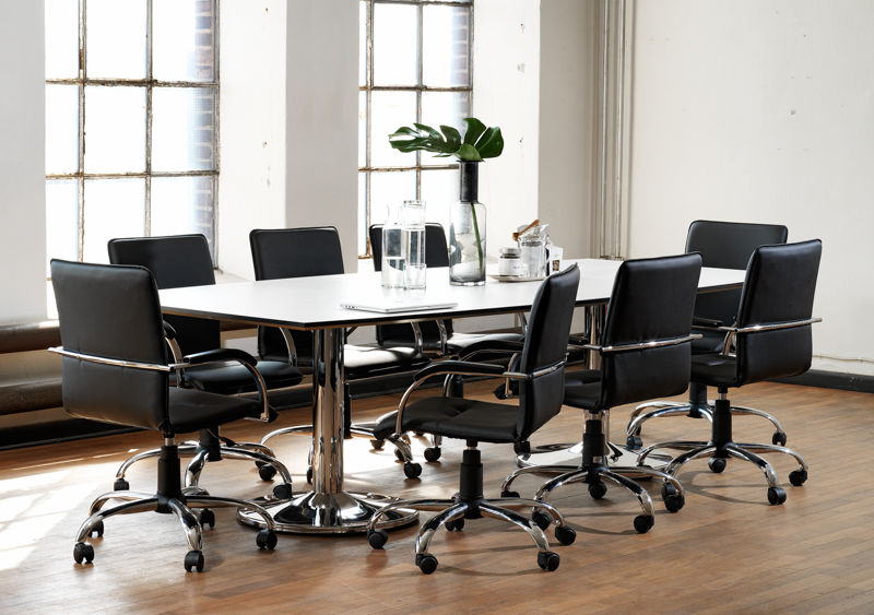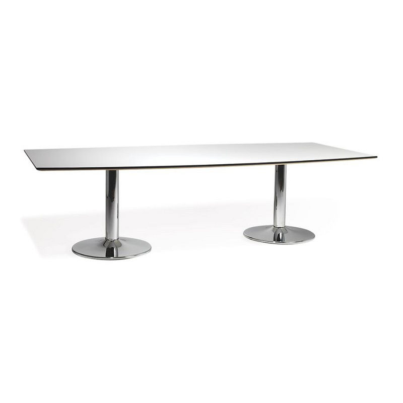 Konferansebord med søylefot, LxB 2600x1200 mm. Bord med søylefot ø 102 mm, gulvplate ø 600 mm. Med justerbare føtter. Plate i hvitt med svart kantlist. 10 sitteplasser.
