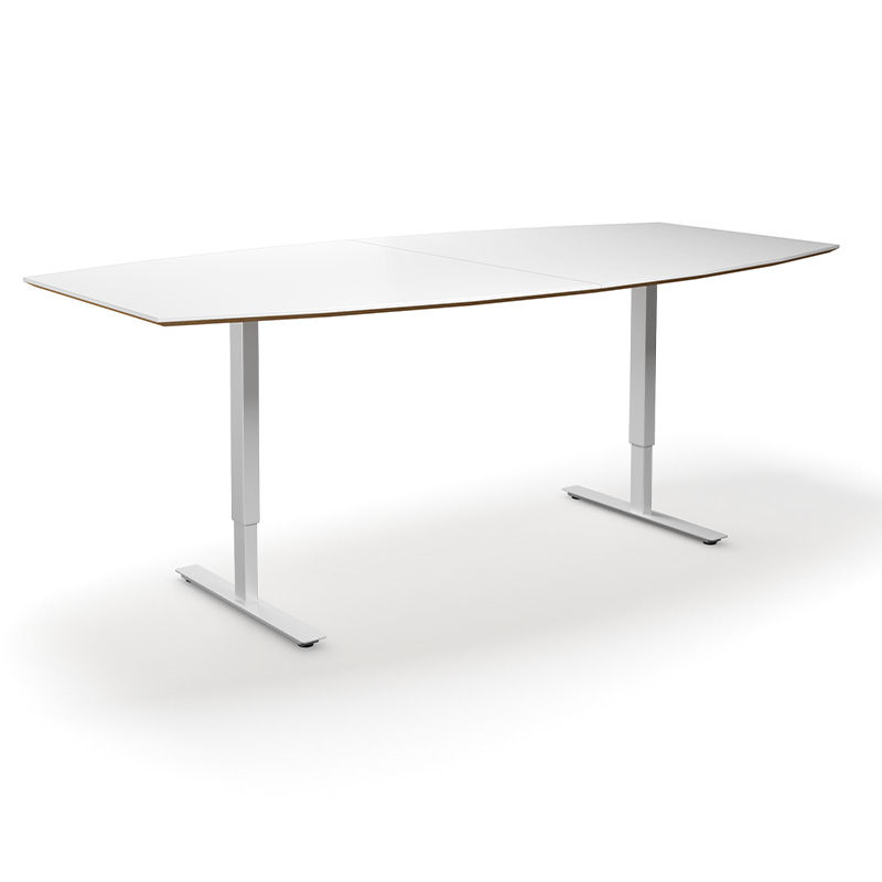 Konferansebord Trend, elektrisk stativ, LxB 2400x1200/800 mm, hvit/hvit, 8 plasser. En moderne serie elektrisk hev- og senkbare konferansebord. Stativene har samme moderne design som våre hev- og senkbare skrivebord i samme serie. Finnes i krom, svart og hvitt understell. Det elektriske stativet har en kraftig motor for å sikre en jevn og stabil justering. Justerbar høyde 690-1190 mm inkl. plate, maks belastning 150 kg ved utbredd last. Platen har faset kant for å gi en stilren følelse av et tynt og moderne konferansebord. Bordplaten er produsert i 25 mm tykk MDF belagt med hvit laminat og en 10 mm hvit kantlist av ABS-plast.