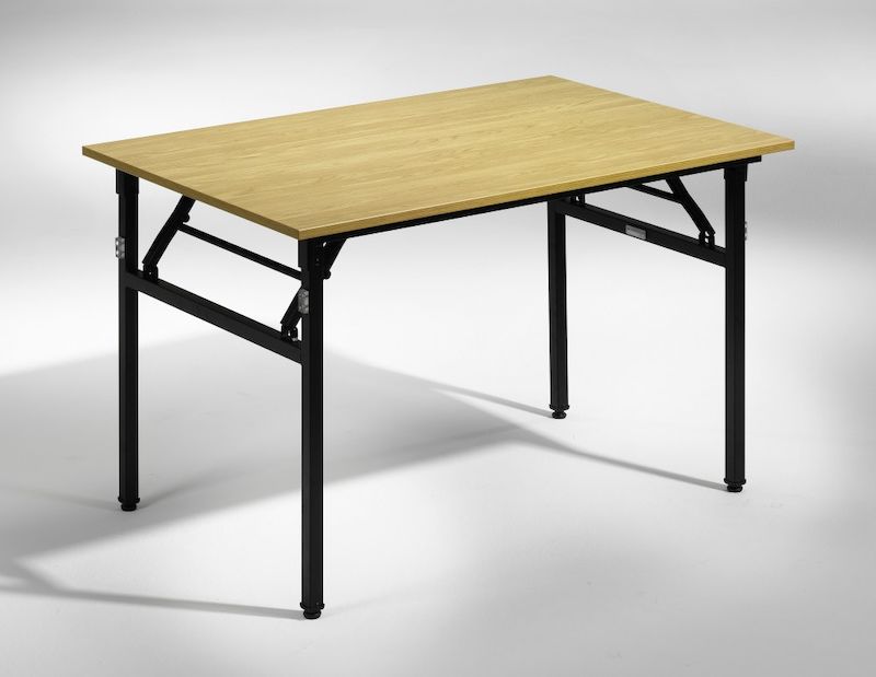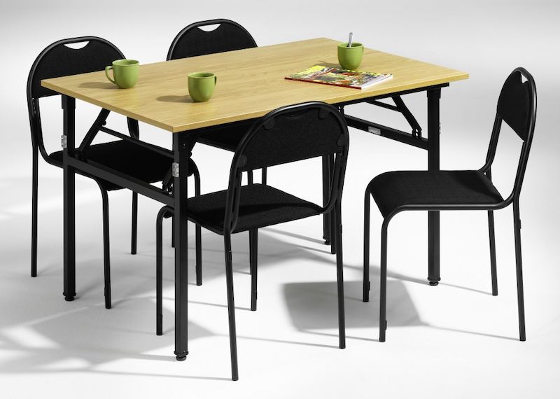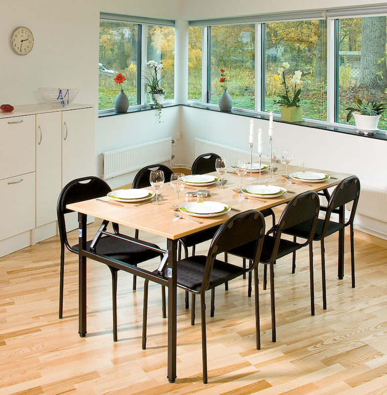 Sammenleggbart bord med laminatplate og kraftig stativ med justerbare føtter. Svartlakkert understell i 30x30 mm stålrør som kan felles opp eller sammen med et enkelt håndgrep. Avstandsstykker for stabling gir god beskyttelse av bordplaten samt sikker og stabil stabling.