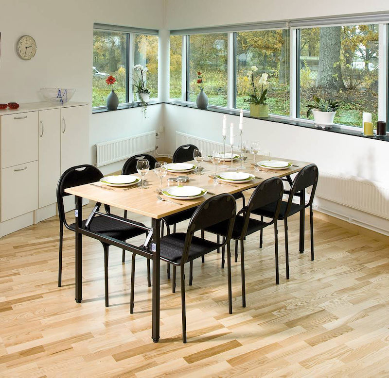 Sammenleggbart bord med laminatplate og kraftig stativ med justerbare føtter. Svartlakkert understell i 30x30 mm stålrør som kan felles opp eller sammen med et enkelt håndgrep. Avstandsstykker for stabling gir god beskyttelse av bordplaten samt sikker og stabil stabling.