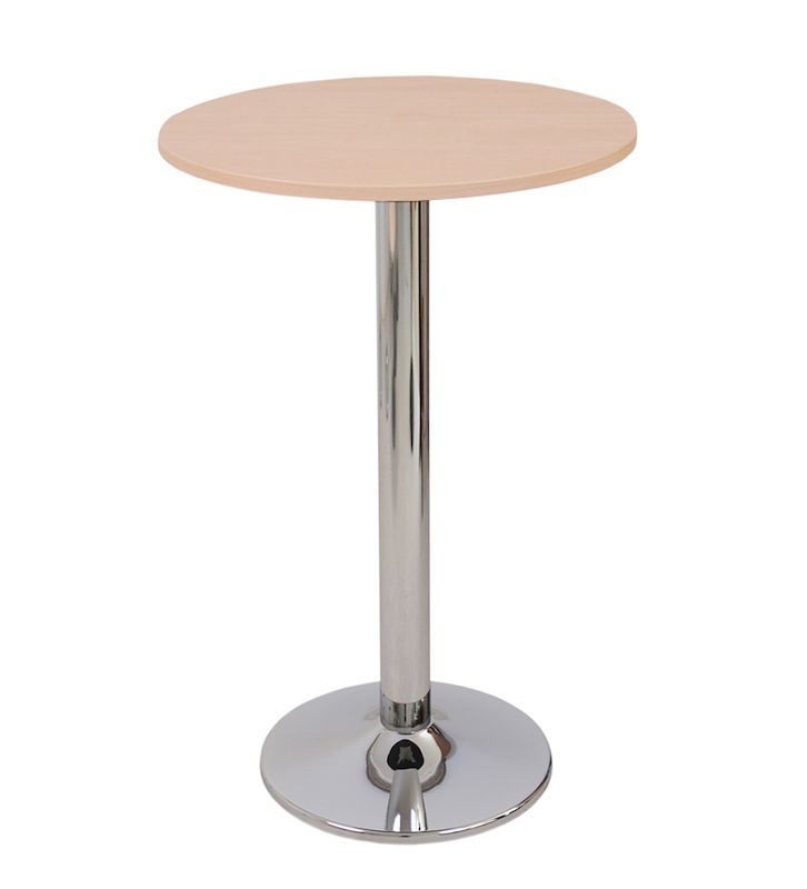 Ståbord Texas, Ø 700 mm, eik/krom. Høyt bord med rund søylefot i krom, svart eller sølv. Justerbare føtter under fotplaten. Plate i bøk, bjørk, eik, hvit eller svart laminat. Finnes med en eller to søyler. Søyle Ø 87 mm og fotplate 500 mm.