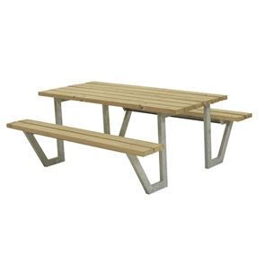 Med denne benken kan du forvente et moderne møbeldesign med rette linjer og naturlig karakter. Bord og benker er forbundet i en enhet, har plass til 6 personer og er best mulig egnet for varig bruk utendørs. Med FSC®-sertifisert furu og en varmegalvanisert stålrørsramme lover dette sittemøbelet langvarig glede ved daglig bruk takket være sin stabile konstruksjon. Ideelt for pause- og rekreasjonsområder utendørs for bedrifter, offentlige institusjoner og park- og friluftssentre.