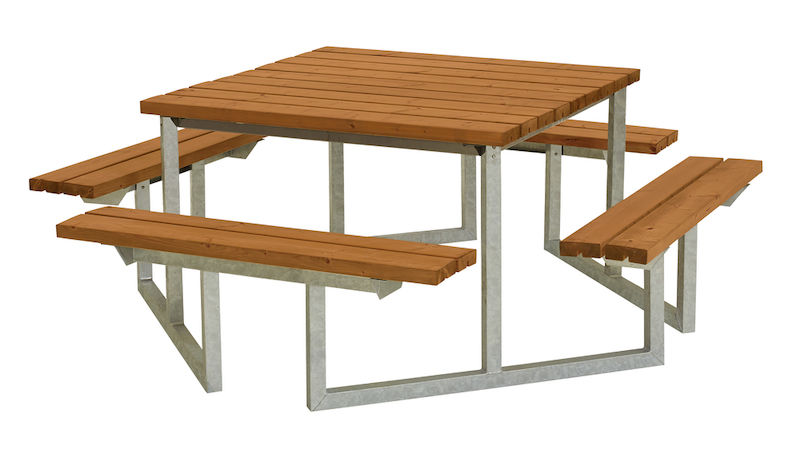 Benkebord for 8 personer Erina, sertifisert furutre, teakfarge. Med denne benken venter det deg et moderne møbeldesign med rette linjer og naturlig karakter. Bord og benker er forbundet i en enhet, har plass til 8 personer og er best mulig egnet for varig bruk utendørs. Med FSC®-sertifisert furutre og en varmegalvanisert stålrørsramme lover dette sittemøbelet langvarig glede ved daglig bruk takket være sin stabile konstruksjon. Benkebordet er tilgjengelig med eller uten ryggstøtte. Ideelt for pause- og rekreasjonsområder utendørs for bedrifter, offentlige institusjoner og park- og friluftssentre.