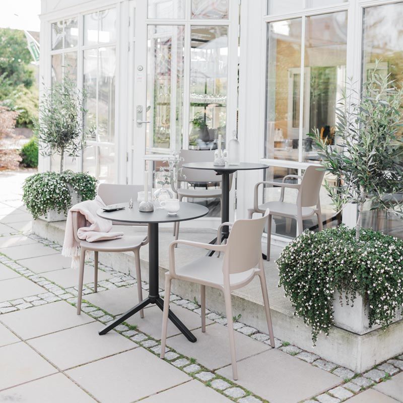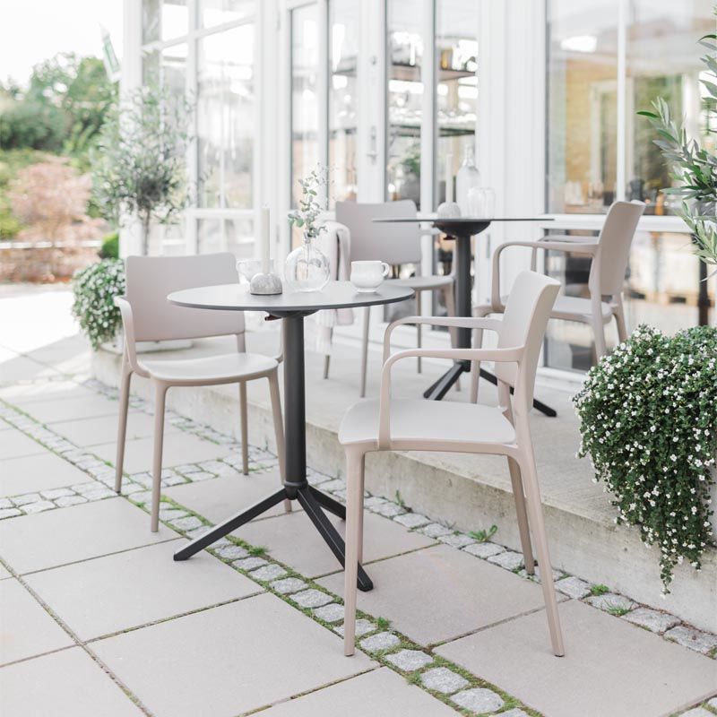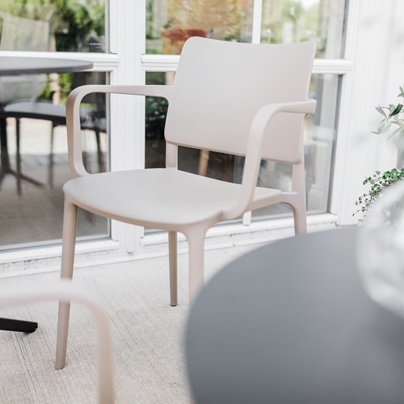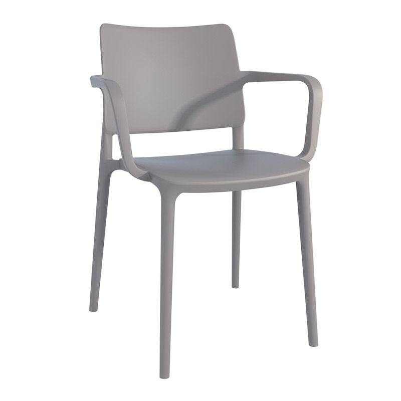 Stol Artin med armlener, brungrå, 4 stk/pk. Stol Artin med armlener er en moderne designet stol med flytende linjer og en tydelig silhuett. Armlener gir en ekstra god sittekomfort. Artin har lav egenvekt med detaljer produsert av glassfiberforsterket polypropylen. Artin er en stol som har en enkel og enhetlig design med skarpe detaljer som gir en solid og behagelig sitteplass. Stolen fungerer både til bolig og bedrift, innen- og utendørs. Finnes i fire forskjellige farger, selges i forpakning med 4 stoler.