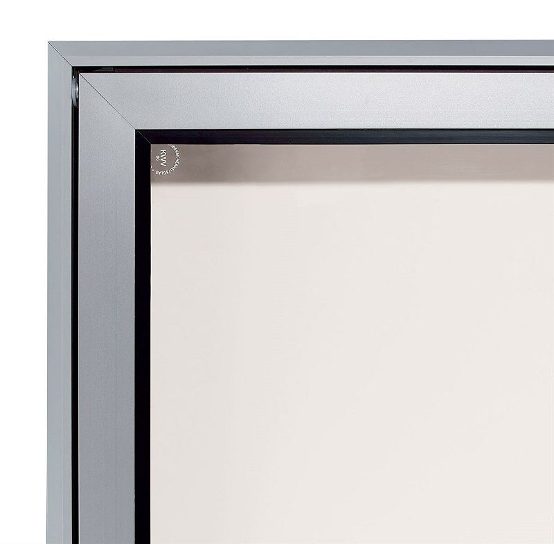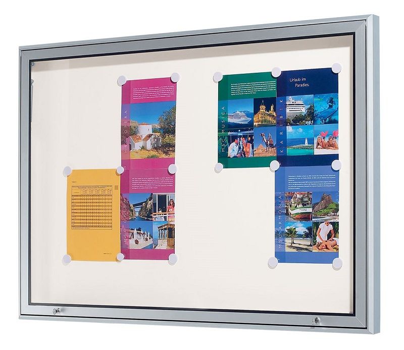 Skiltskap, aluminiumsramme, for innendørs og utendørs bruk, kapasitet 27 A4-blad, HxBxD 1010 x 2000 x 50 mm, runde hjørner. Valgfritt for innendørs eller utendørs bruk. Utvendig dybde 50 mm, utnyttbar innvendig dybde 20 mm Galvanisert, magnetisk, hvit (RAL 9010) pulverlakkert metallbakvegg. Stabil, vridningsstiv spesialramme i aluminium, sølveloksert. Innelukket hengseldør i aluminium med skjulte beslag av trykkstøpegods og robust 4 mm tykt herdet glass. Ekstremt ripesikker og stabil glassoverflate, tåler rengjøringsmidler. Frontal sikkerhetssylinderlås (2 nøkler). Topphengslet.