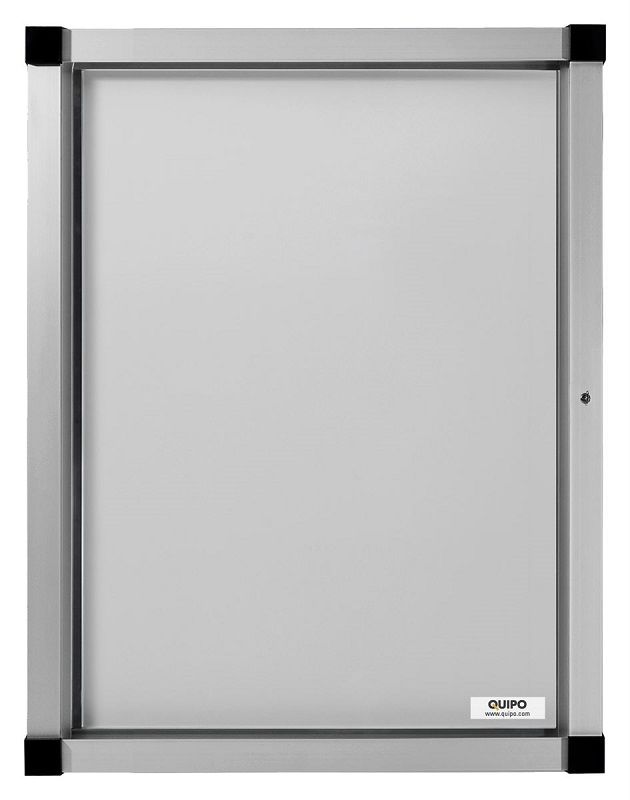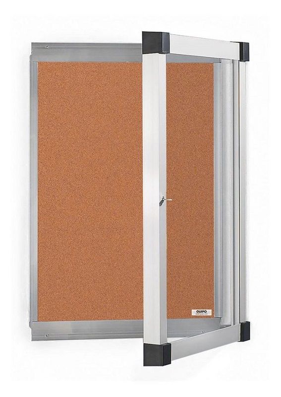 Oppslagsskap for innen- og utendørsbruk, med låsbar dør. Høyverdig aluminiumsramme, naturfarger eloksert. Herdet glass (ESG), 4 mm tykt. Dekorative plasthjørner. For utendørs eller innendørs bruk. En skumgummitetning for vanntetthet. Ingen kondens gjennom naturlig luftutveksling ved hjelp av labyrinttetning. Døranslag kan monteres til venstre eller høyre. Låsbar (2 nøkler).