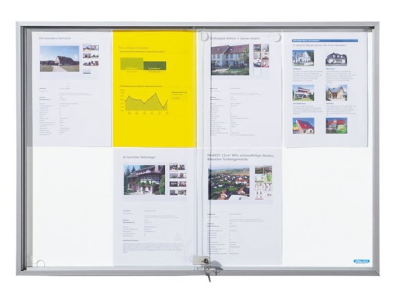 Oppslagsskap med skyvedører, BxHxD 2006x947x50 mm, metall. Til innendørs bruk. Ideell for trange rom. Ramme av aluminium, sølvelkosert. 4 mm herdet sikkerhetsglass. Sikkerhetssylinderlås (2 nøkler). Byggematerialklasse B1 (tungt antennelig) iht. DIN 4102. Ideell for utrustning av skoler, offentlige bygninger og instanser. Utvendig dybde: 50 mm. Utnyttbar innvendig dybde: 24 mm.