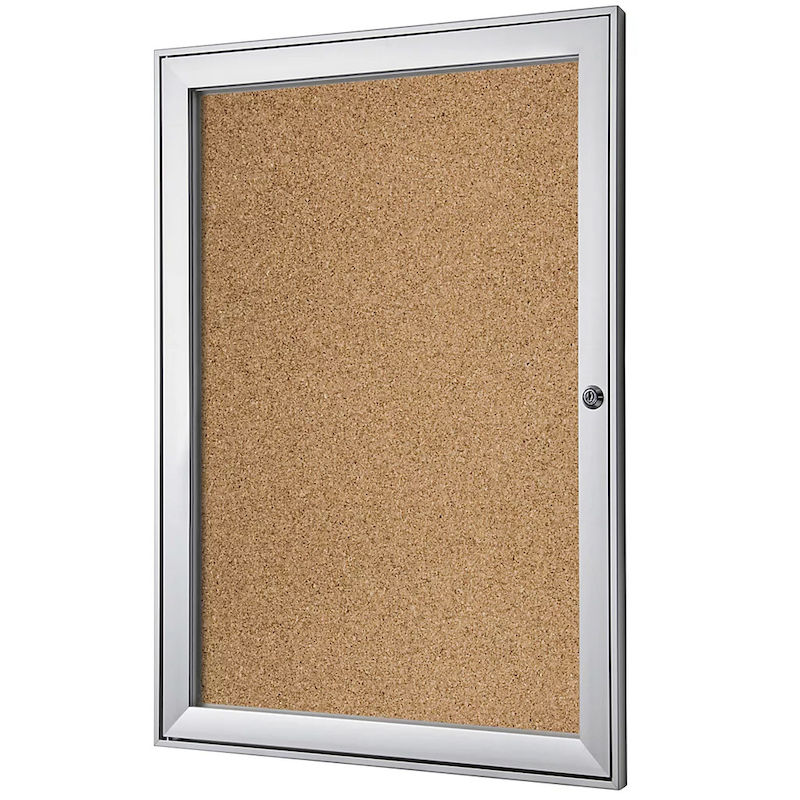 Oppslagsskap til innendørs bruk, HxBxD 522x697x33 mm, kork. Elegant og tidløs. Ramme og hengseldør av aluminium, sølveloksert. 3 mm akrylglass. Sikkerhetssylinderlås (2 nøkler). Utvendig dybde: 33 mm. Utnyttbar innvendig dybde: 22 mm.